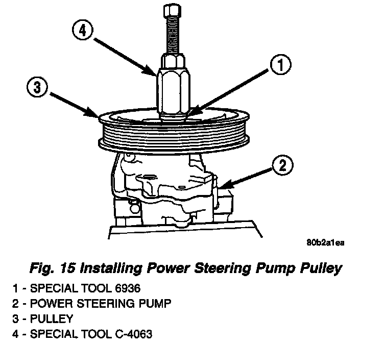 NOTE: Do not press or hammer on the shaft of the power steering pump in an attempt to remove the pulley. This will damage the internal components of the power steering pump.