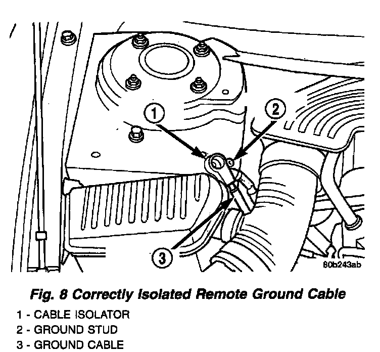 REMOVAL1. Remove the battery ground cable from the ground stud on the shock tower and isolate the ground cable by installing the cable isolator on the ground stud.