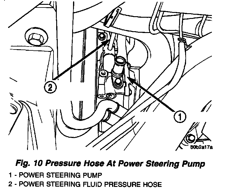 7. Remove the power steering fluid pressure hose from the pressure fitting on the power