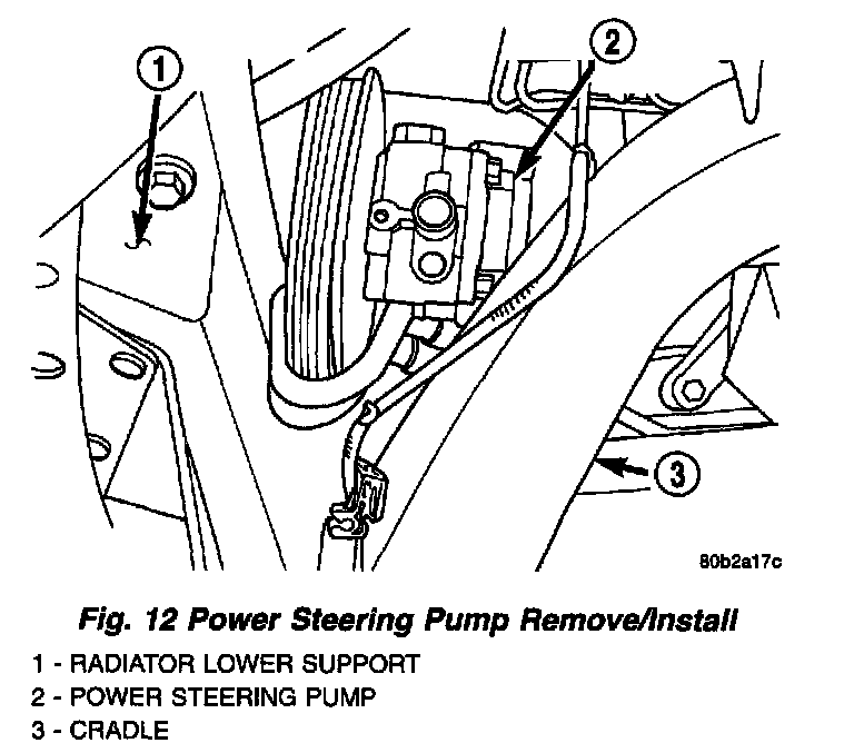 13. Remove the power steering pump from the engine. The power steering pump and pulley are removed as an assembly from the engine. The power steering pump is removed from the bottom of the engine between the radiator lower support and the cradle.