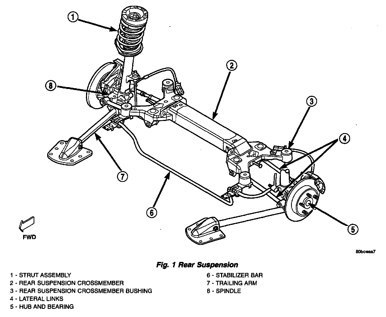 The lateral movement of the rear spindle is controlled by the lateral links connecting the front and rear centerline of the spindle to the rear suspension crossmember. The threaded adjustment sleeve of the rear link allows for setting rear wheel alignment toe adjustment.