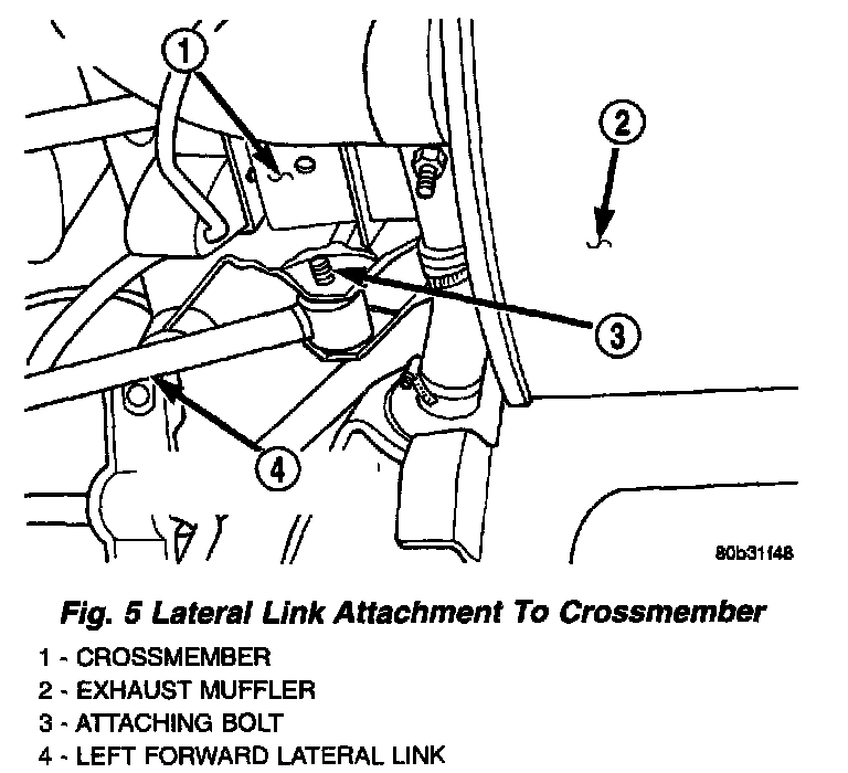 REMOVAL-LATERAL LINKSThe left forward lateral link requires a more involved removal and installation procedure in order to remove the attaching bolt at the crossmember. See separate procedures below for the proper lateral link service procedure.