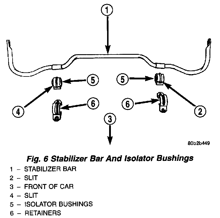 4. Inspect for broken or distorted retainers and bushings. If bushing replacement is required, the bushing can be removed by opening the slit in the bushing and removing the bushing from around stabilizer bar. The stabilizer bar to cradle assembly bushings must be positioned on the stabilizer bar so the slit in the bushing is positioned toward front of vehicle.
