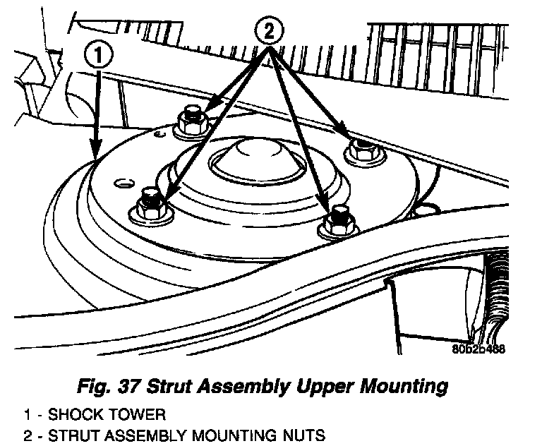 REMOVAL-STABILIZER BAR (FRONT)1. Remove the 4 strut assembly upper mount to strut tower mounting nut and washer assemblies securing the right front strut in place.