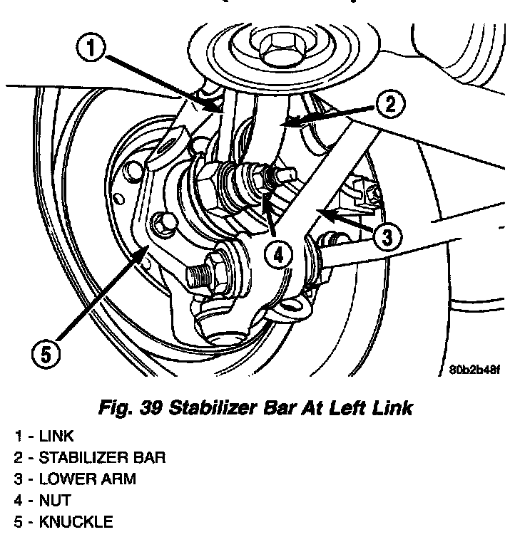 6. Remove the left stabilizer bar link nut at the stabilizer bar. Remove the link from the stabilizer bar.