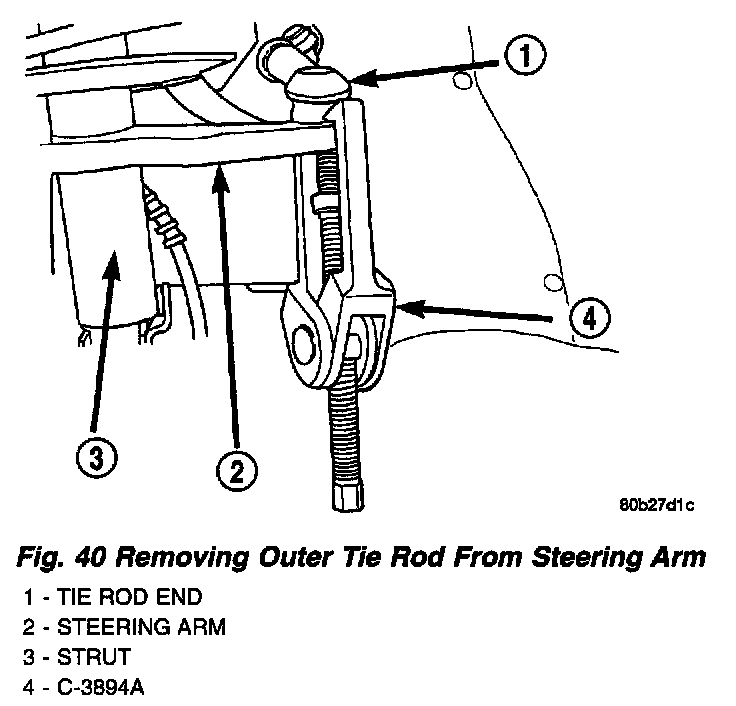 6. Loosen, but do not remove, the right outer tie rod end to strut arm attaching nut. Release right outer tie rod end from right strut steering arm using Puller, Special Tool C-3894A, then remove nut and tie rod from the steering arm.