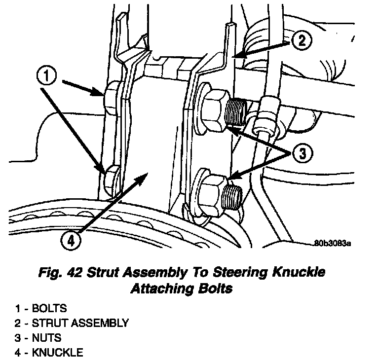 CAUTION: The strut assembly to steering knuckle bolts are serrated were they go through strut assembly and steering knuckle. When removing bolts, turn nuts off bolts DO NOT TURN BOLTS IN STEERING KNUCKLE. If bolts are turned damage to steering knuckle will result.