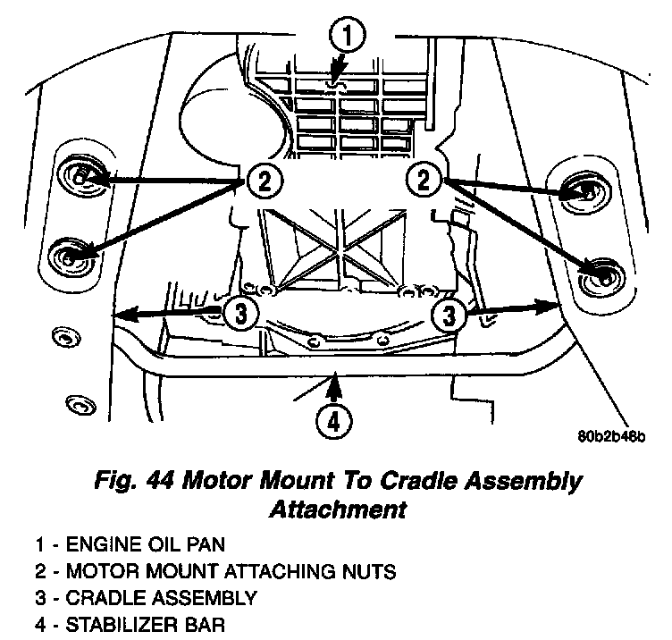 3. Install the 4 engine motor mount to cradle assembly attaching nuts. Tighten the 4 nuts to a torque of 61 Nm (45 ft. lbs.).