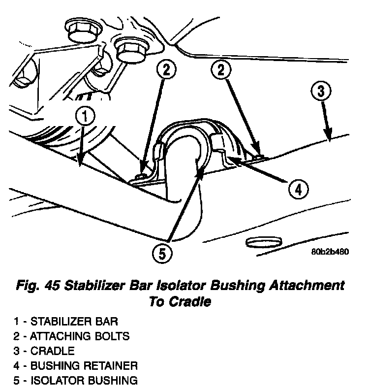 2. Remove the 2 bolts attaching each of the 2 stabilizer bushing retainers and bushings to the cradle assembly.