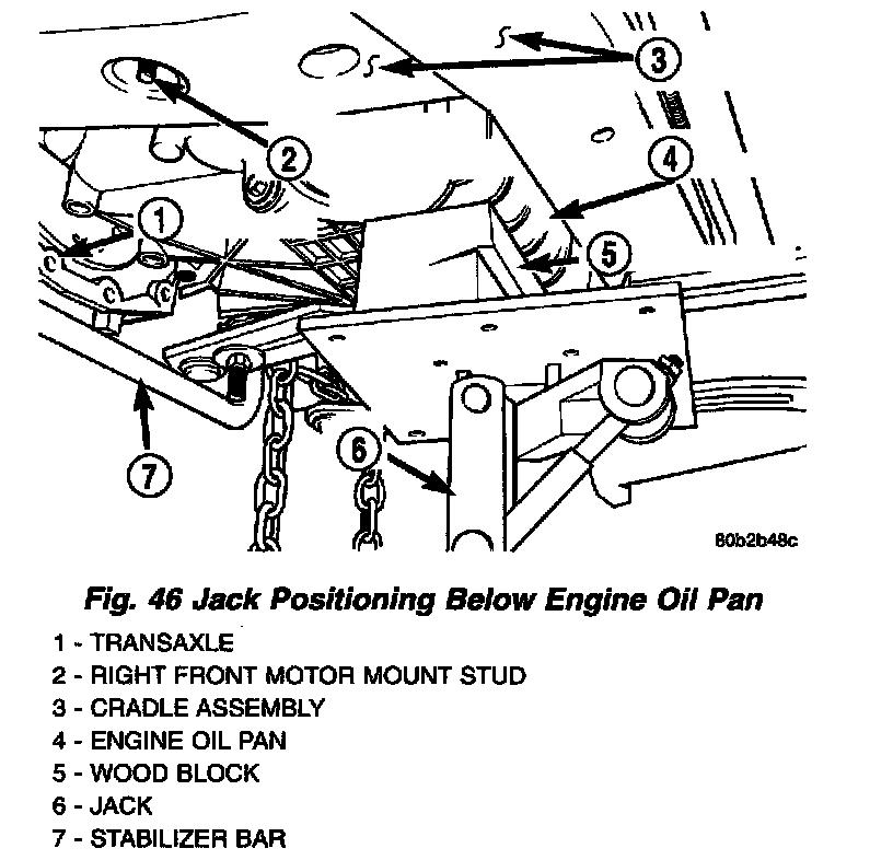14. Position a transmission jack under the body of the engine oil pan. Use a wood block as a buffer between the jack and the engine oil pan in order to avoid damage to the pan. Carefully raise the jack until the motor mounts clear the cradle assembly. It may be necessary to raise the jack further.