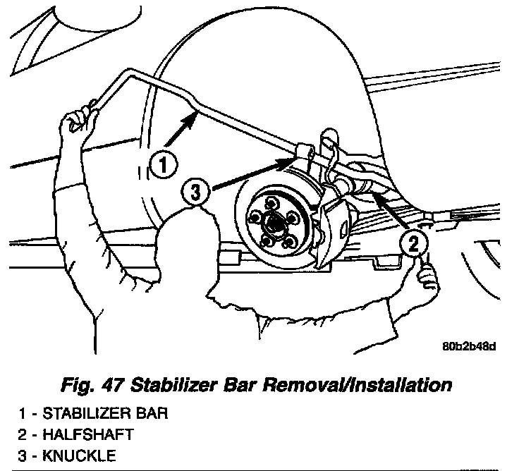 1. Install stabilizer bar by reversing the manner in which it was removed. Rotate the bar the opposite direction used when removed and move it into mounting position.
