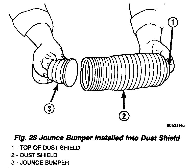 4. Install the jounce bumper into the dust shield from the bottom. The jounce bumper should snap into position at the ton end of the dust shield.