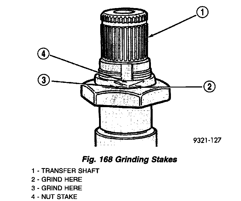 Using a die grinder or equivalent, grind the stakes in the shoulder of the shaft nut as shown in (Fig. 168) and (Fig. 169). Do not grind through the transfer shaft nut into the shaft. There are two stakes on the nut.