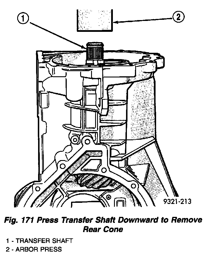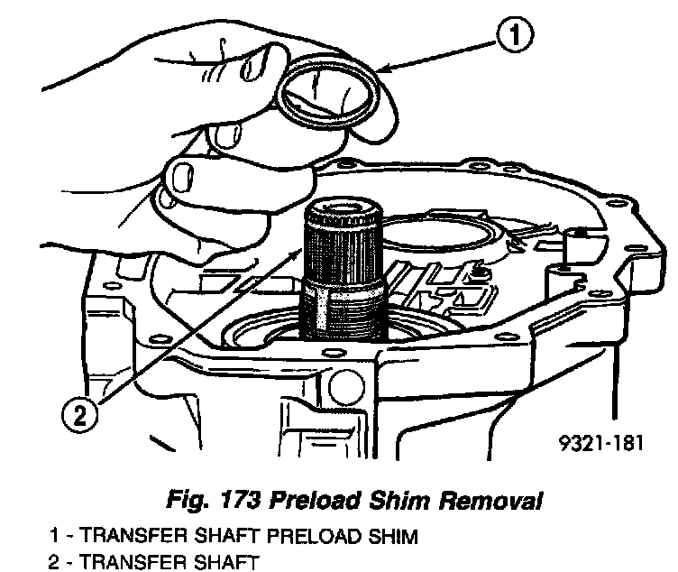 Remove transfer shaft preload shim (Fig. 173). If transfer shaft bearings are to be reused, the original shim must also be reused.