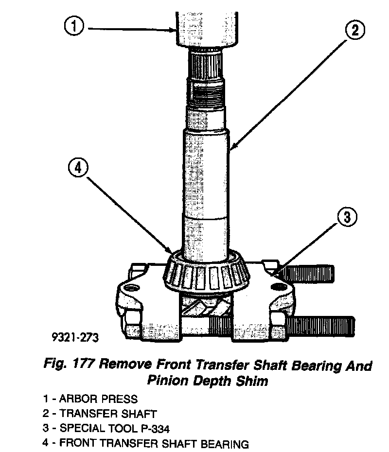 Support special tool P-334 on press table so that pinion head of transfer shaft can be pressed through table (Fig. 177).