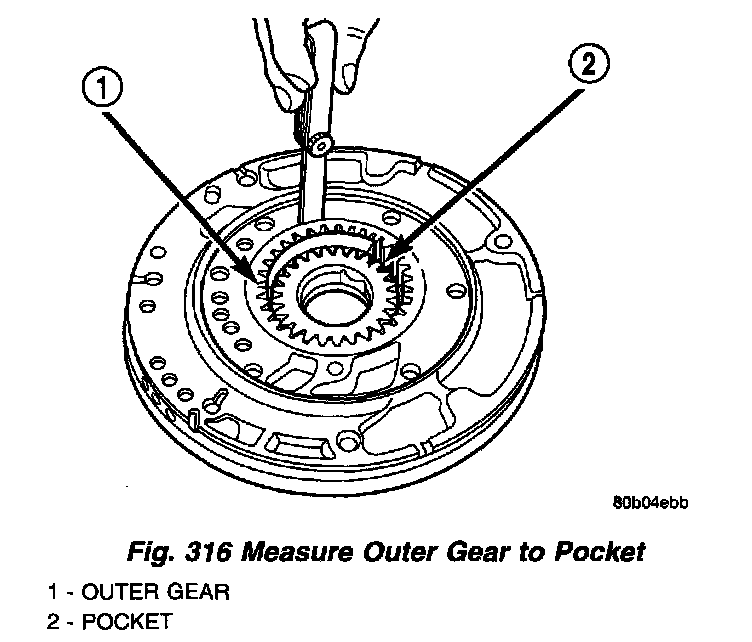 (5) Measure the clearance between the outer gear and the pump pocket (Fig. 316). Clearance should be 0.045 - 0.141 mm (0.0018 - 0.0056 inch).