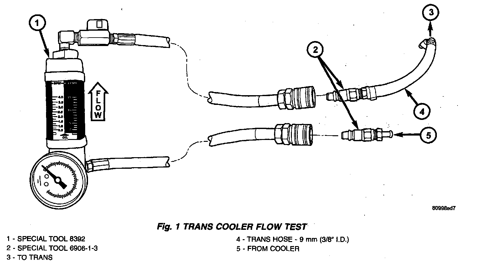 2. Using Special Tool adapters 6906-1-3 with a 9 mm (3/8 inch) transmission hose attached to one adapter, connect Special Tool 8392 flow meter in-series with the oil cooler flow circuit (Fig. 1).