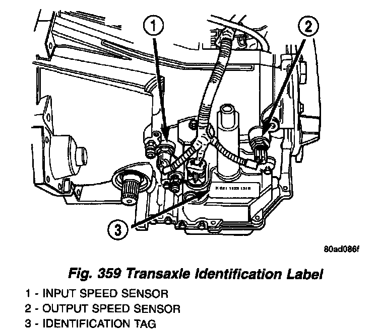 The Output Speed Sensor is a two-wire magnetic pickup device that generates an AC voltage signal as rotation occurs. It is threaded into the transaxle case (Fig. 359), sealed with an O-ring (Fig. 360), and is considered a primary input to the Transmission Control Module (TCM).