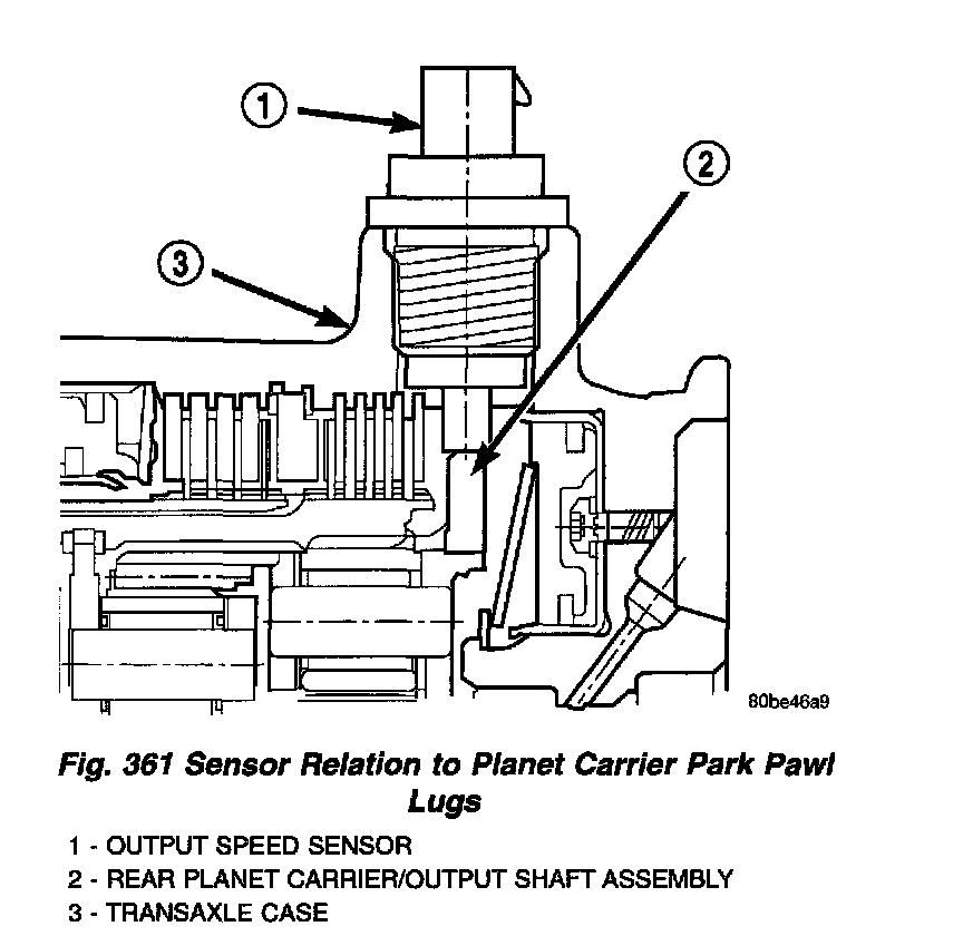 The Output Speed Sensor provides information on how fast the output shaft is rotating. As the rear planetary carrier park pawl lugs pass by the sensor coil (Fig. 361), an AC voltage is generated and sent to the TCM. The TCM interprets this information as output shaft rpm.