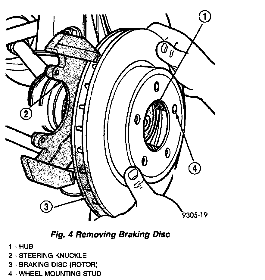(4) Remove front braking disk (rotor) from hub, by pulling it straight off wheel mounting studs (Fig. 4).