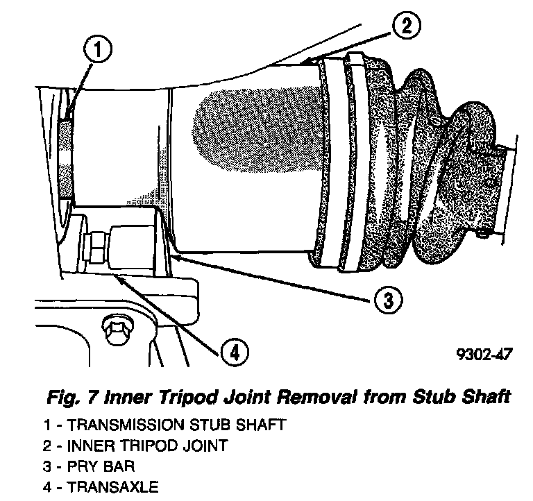 (7) Dislodge inner tripod joint from stub shaft retaining snap ring on transaxle assembly (Fig. 7). Inner tripod joint is dislodged from stub shaft retaining snap ring, by inserting a pry bar between transaxle case and inner tripod joint and prying on tripod joint. Only disengage the inner tripod joint from the retaining snap ring. Do not attempt to remove the inner tripod joint from the transmission stub shaft at this time.