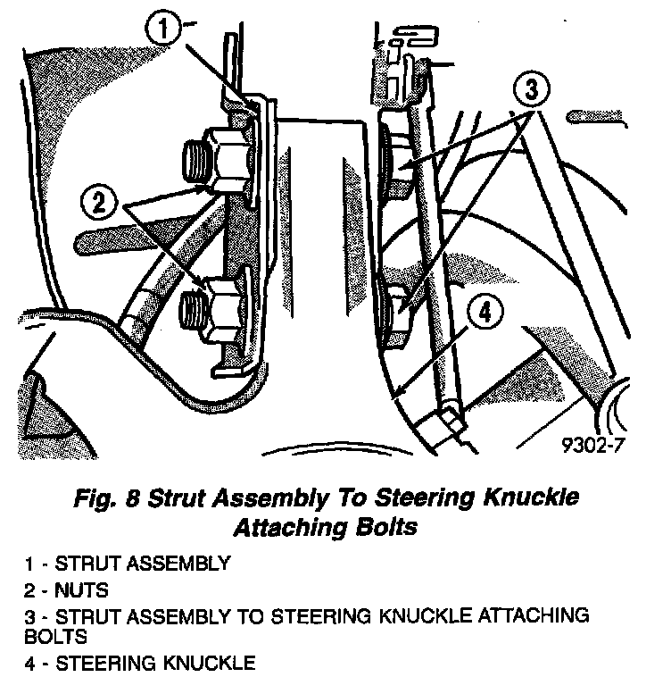 (8) Remove the strut assembly to steering knuckle attaching bolts (Fig. 8).