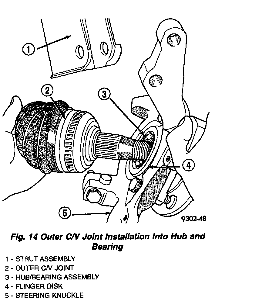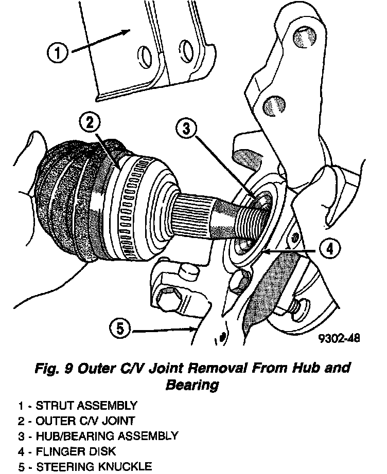 CAUTION: When removing outer C/V joint from hub and bearing assembly, do not allow the flinger disk (Fig. 9) on hub and bearing assembly to become damaged. Damage to the flinger disk will cause dirt and water intrusion into bearing. Premature bearing failure will result.