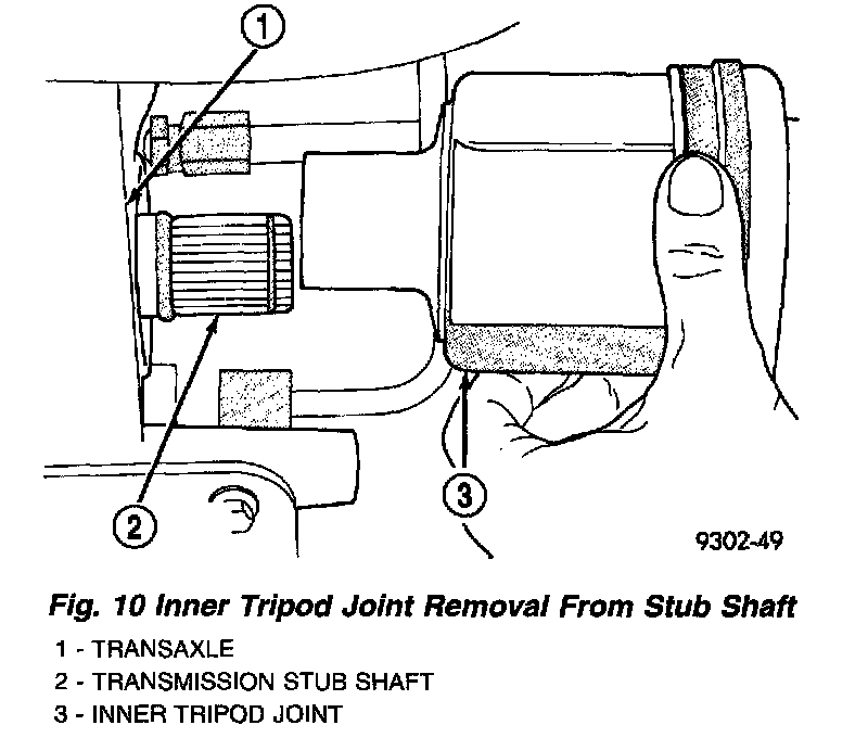 (11) Remove driveshaft inner tripod joint from transaxle stub shaft. When removing driveshaft, do not pull on interconnecting shaft to remove inner tripod joint from stub shaft. Removal in this manner will separate the spider assembly from the tripod joint housing. Grasp inner tripod joint (Fig. 10) and interconnecting shaft and pull on both pieces at the same time.