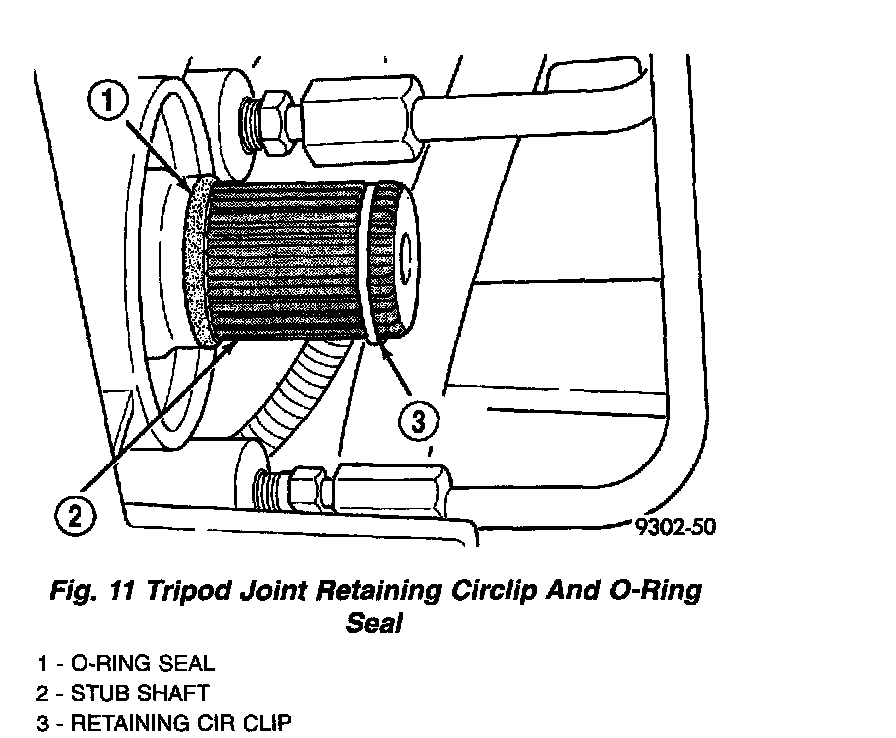CAUTION: The inboard tripod joint retaining circlip and O-ring seal (Fig. 11) on the transaxle stub shaft, are not re-usable. Whenever the inboard tripod joint is removed from the stub shaft, the retaining circlip and O-ring seal MUST BE REPLACED. The retaining circlip and O-ring seal is included in all service kits requiring removal of the inboard tripod joint from the stub shaft.