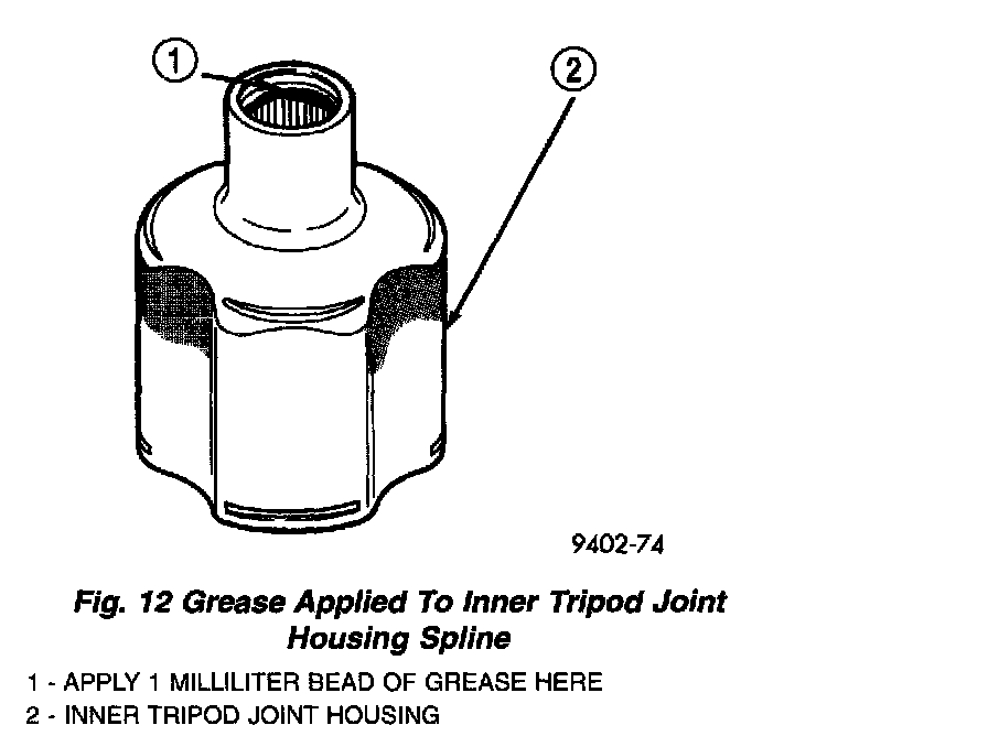 (2) Evenly apply a bead of grease, such as Mopar Multi-Purpose Lubricant or an equivalent, around spline of inner tripod joint (Fig. 12) where the O-ring seats against tripod joint. This will spread grease onto stub shaft during tripod joint installation preventing corrosion and help to seal the O-ring.