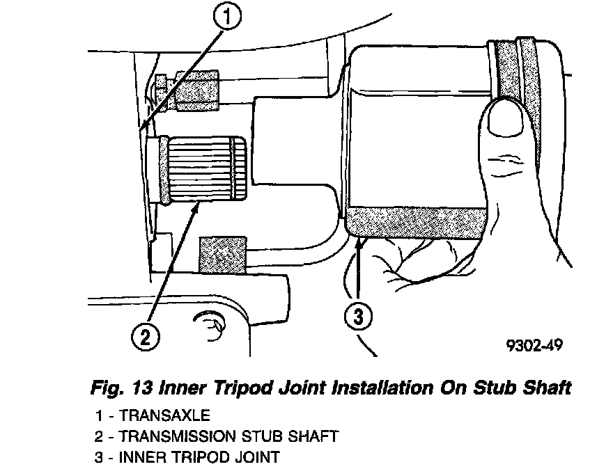 (3) Install driveshaft through hole in splash shield. Grasp inner tripod joint in one hand and interconnecting shaft in the other. Align inner tripod joint spline with stub shaft spline on transaxle (Fig. 13). Use a rocking motion with the inner tripod joint, to get it past the circlip on the transaxle stub shaft.