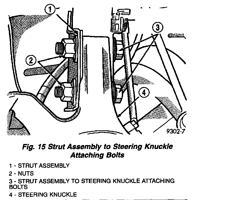(7) Install the strut assembly to steering knuckle attaching bolts. Install nuts on attaching bolts (Fig. 15). Tighten the strut assembly to steering knuckle bolt nuts to 210 Nm (155 ft. lbs.). TURN NUTS ON BOLTS. DO NOT TURN BOLTS.