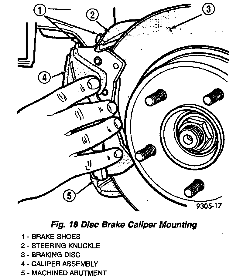 (11) Install front brake caliper over braking disc and align with caliper mounting holes on steering knuckle (Fig. 18). Install the caliper to steering knuckle bolts. Tighten bolts to 22 Nm (192 inch lbs.).