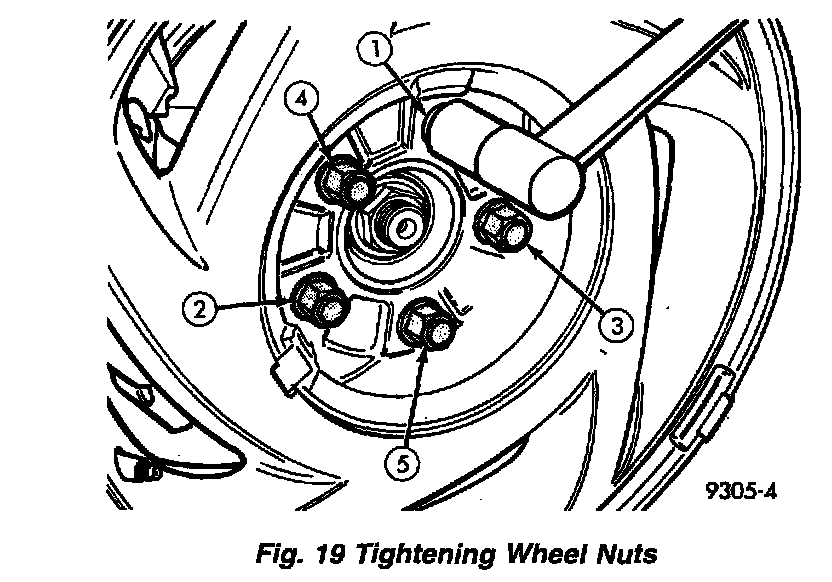 (12) Install wheel and tire assembly on vehicle. Tighten the wheel mounting stud nuts in proper sequence (Fig. 19), until all nuts are tightened to half specification. Then repeat the tightening sequence to the full specified torque of 135 Nm (100 ft. lbs.).
