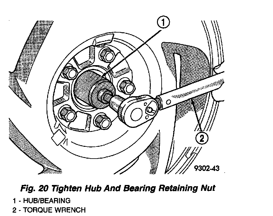 (14) Apply the vehicle's brakes to keep vehicle from moving. Tighten the NEW stub shaft to hub and bearing assembly retaining nut to 142 Nm (105 ft. lbs.) (Fig. 20).