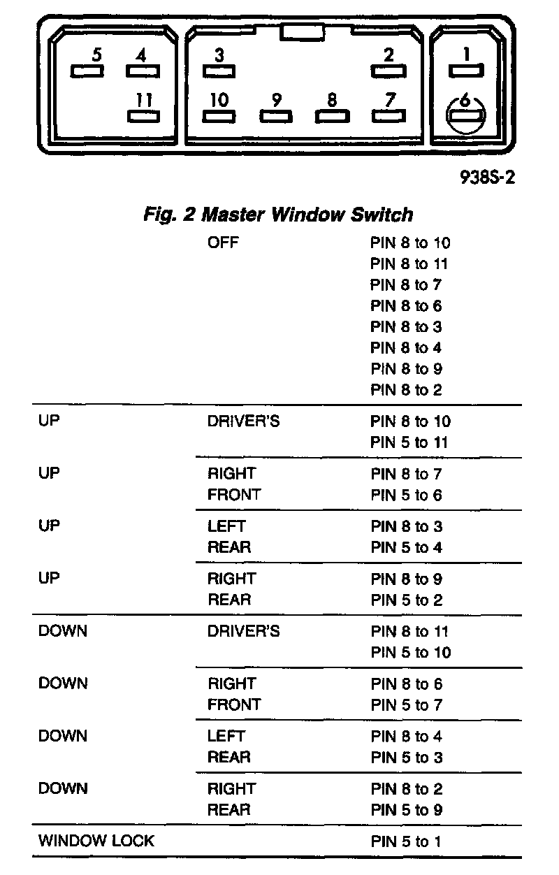 For switch testing, remove the switch from its mounting, refer to Switch Removal. Using an ohm-meter, refer to Window Switch Continuity Charts to determine if continuity is correct and. If the results are not obtained, replace the switch.