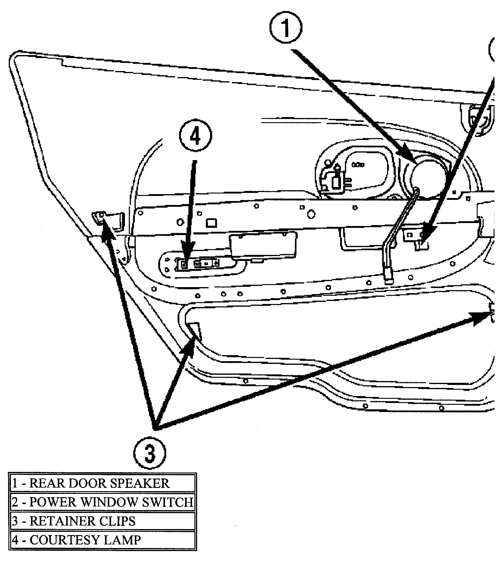 4. Remove three screws from the bottom edge of door (REAR DOOR TRIM PANEL - TYPICAL).