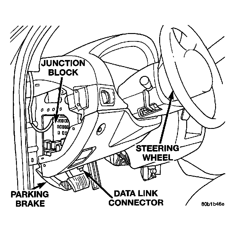3. Connect the DRBIII(R) scan tool to the Data Link Connector located under the instrument panel to the left of the steering column. If the DRBIII(R) does not power-up, check the power and ground supplies to the connector.