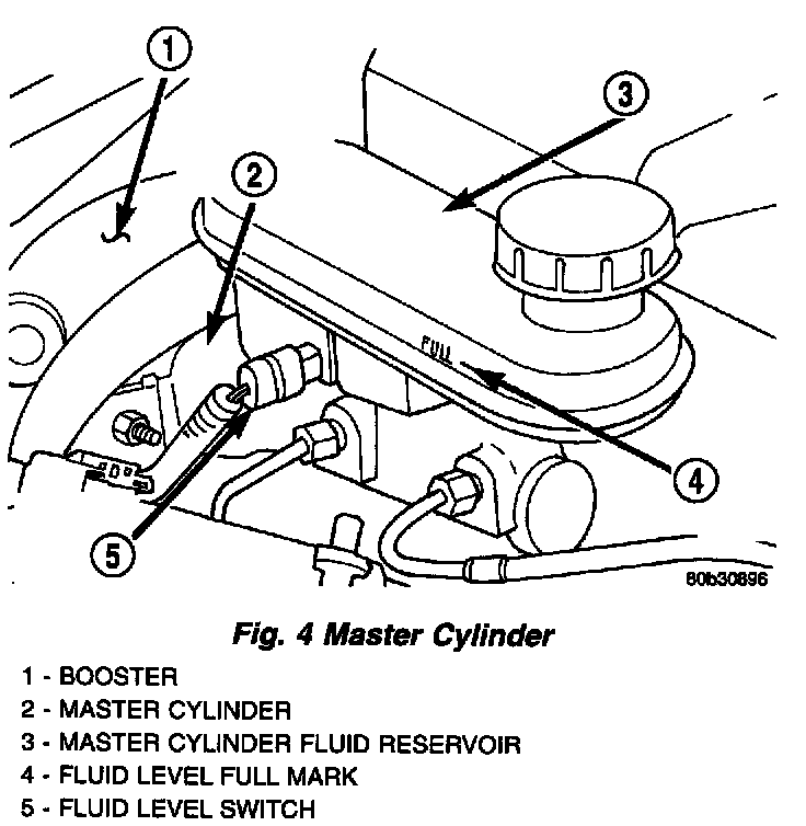 As the fluid drops below the designed level, the switch closes completing the red BRAKE warning indicator lamp circuit. This will illuminate the red BRAKE warning indicator lamp located in the instrument cluster. At this time, the master cylinder fluid reservoir should be checked and filled to the full mark with DOT 3 brake fluid. If the brake fluid level has dropped in the brake fluid reservoir, the entire brake hydraulic system should be checked for evidence of a leak.