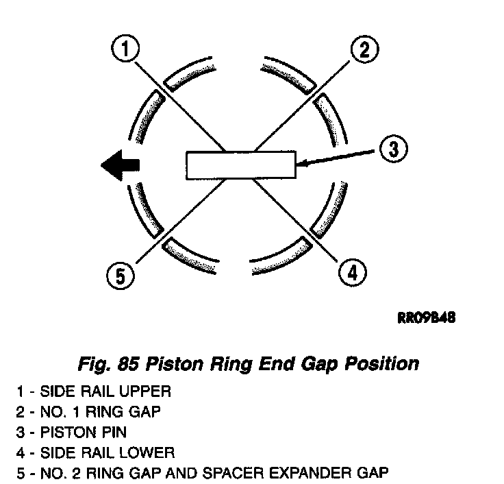 3. Before installing pistons and connecting rod assemblies into the bore, ensure that compression ring gaps are staggered so that neither is in line with oil ring rail gap (Fig. 85).