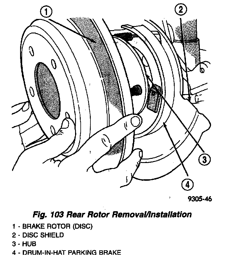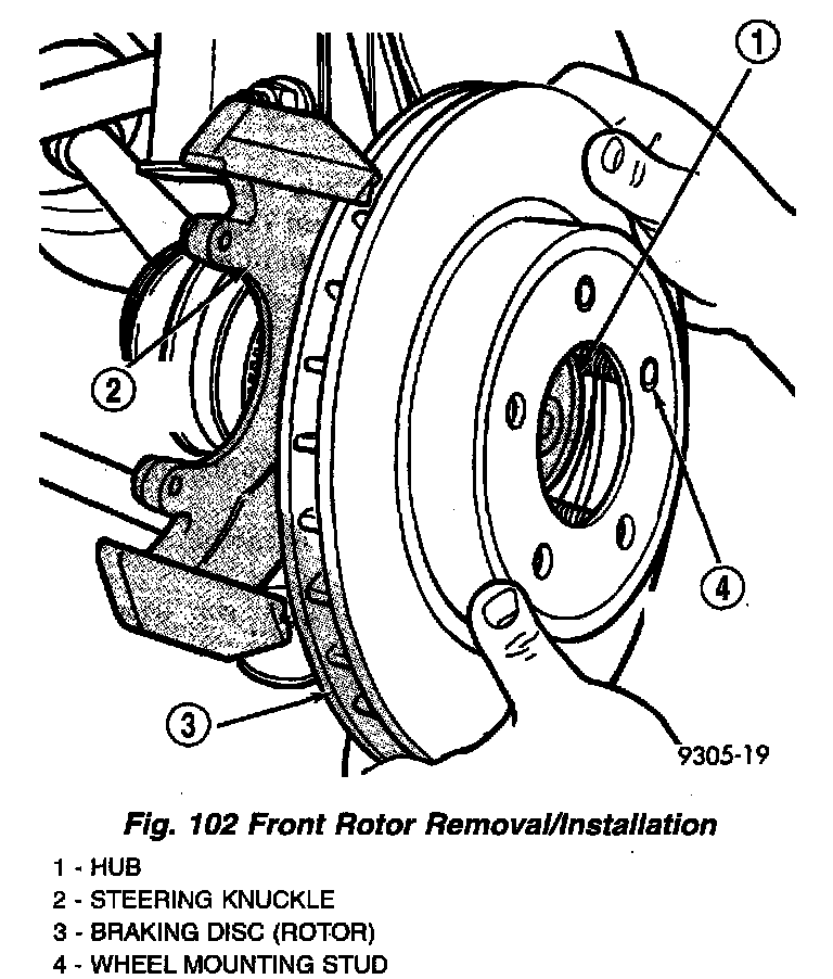 REMOVAL - BRAKE ROTOR (FRONT)1. Remove disc brake caliper and store (hang) it out of the way following the procedure found in Brake Pads/Shoes.