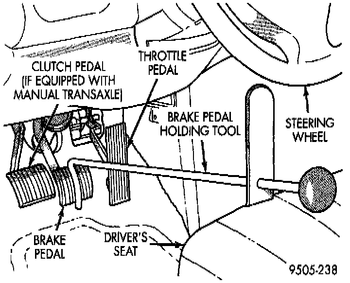 3. Using a brake pedal positioning tool such as shown depress brake pedal past its first 1 inch of travel and hold in this position. This will isolate the master cylinder reservoir from the brake hydraulic system, not allowing the brake fluid to drain out of the reservoir.