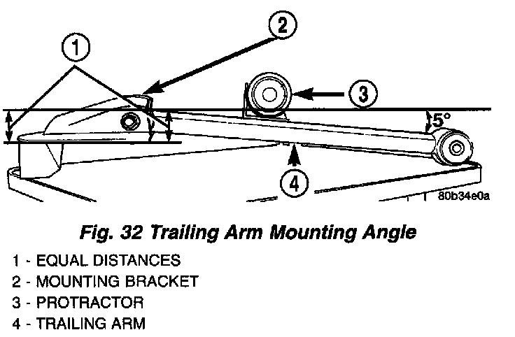 CAUTION: When the trailing arm is installed to its mounting bracket, it is important to set an offset angle of 5 degrees before tightening the attaching bolt. Otherwise, the bushing will be contorted when the vehicle is at normal riding height. This angle cannot be set once the trailing arm and bracket are installed on the vehicle.