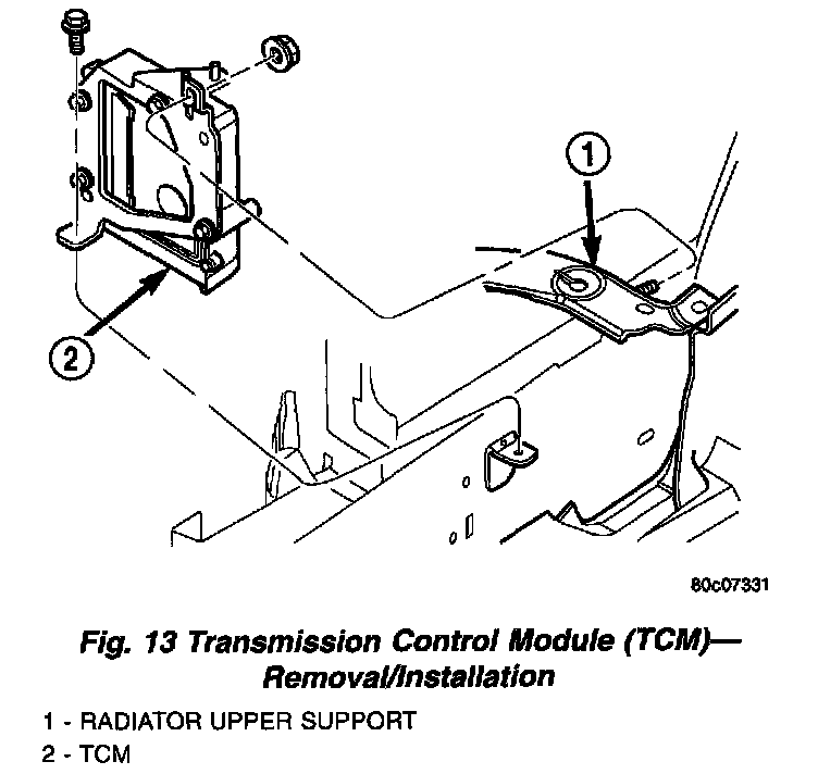 6. Remove transmission control module mounting screws and lift module from vehicle (Fig. 13).