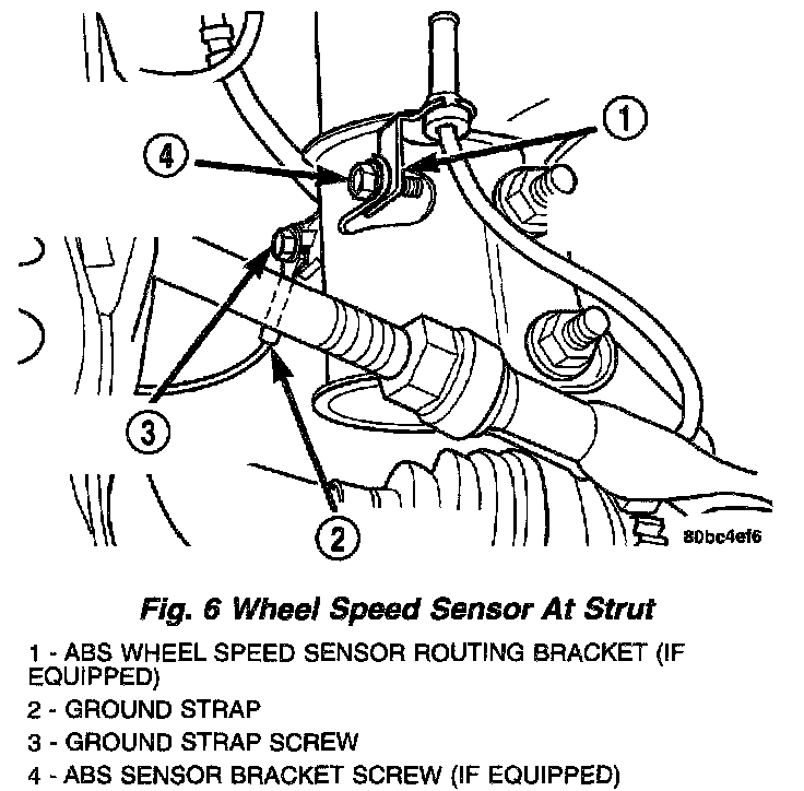 3. From the sensor bracket on the strut, loop the sensor cable upward, then downward at the outside of the frame rail. Install the speed sensor cable grommet onto the retaining bracket attached to the brake hose on the outside of the frame rail.