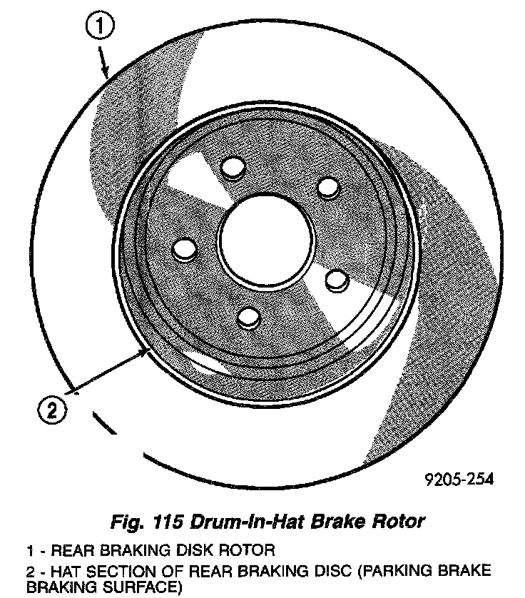 The parking brakes on vehicles equipped with rear disc brakes consist of a small duo-servo brake assembly mounted to the disc brake caliper adapter. The hat (center) section of the rear brake rotor serves as the braking surface (drum) for the parking brakes. This parking brake application uses the same operating cable configuration as the drum brake equipped vehicles, but different cables.