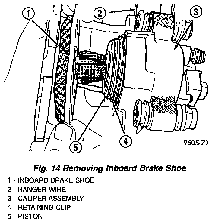 8. Pull the inboard brake shoe away from the caliper piston until the retaining clip is out of the cavity in the piston and remove the shoe.
