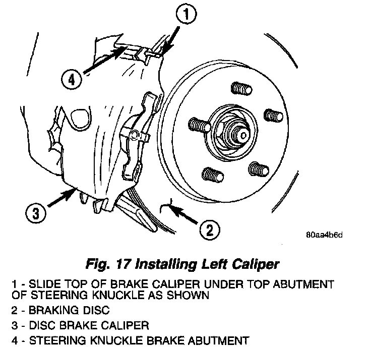 7. Install the disc brake caliper (with pads) on the brake rotor and steering knuckle. The left side caliper is installed by first sliding the top of the caliper past the top caliper slide abutment on the steering knuckle to hook the top edge of the caliper, then pushing the lower end of the caliper into place against the knuckle. The right side caliper is installed by first sliding the bottom edge of the caliper past the lower caliper slide abutment on the steering knuckle to hook the lower edge of the caliper, then pushing the top of the caliper into place against the steering knuckle.