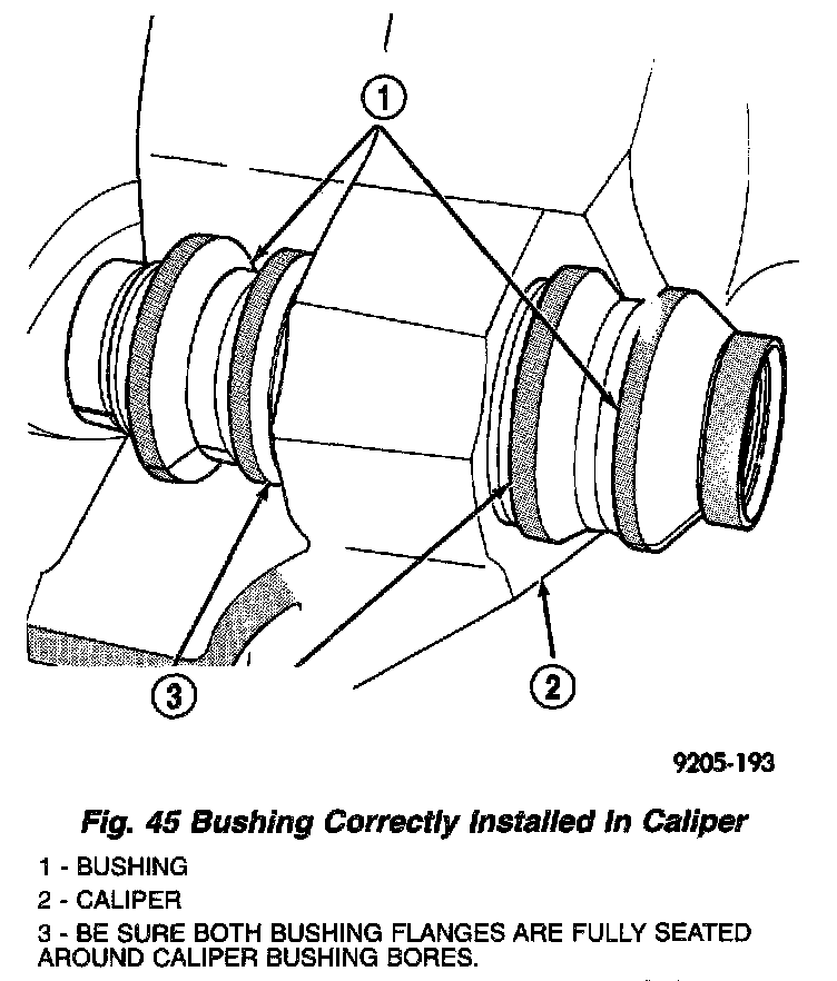 CAUTION: Use care when installing the caliper assembly onto the steering knuckle so the seals on the caliper guide pin bushings do not get damaged by the steering knuckle bosses.