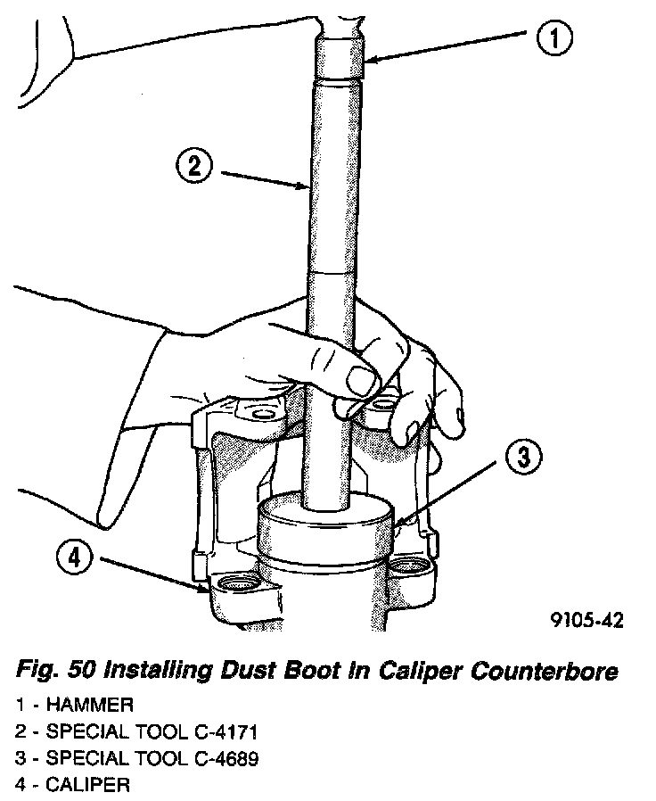 6. Using a hammer and Installer, Special Tool C-4689, and Handle, Special Tool C-4171, drive the boot into the counterbore of the caliper.